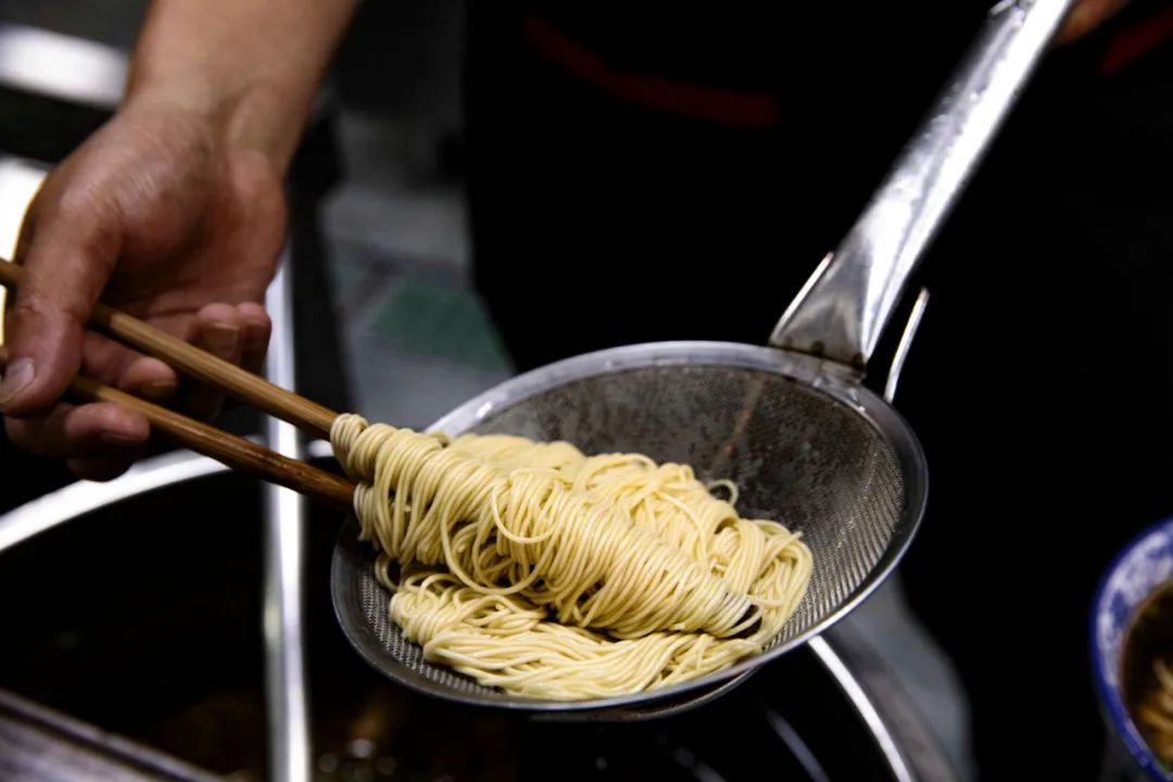 煮面时一把抓准不同的分量只是基本功。面出锅才是见真章的时候。师傅一手漏勺一手筷,边翻边抖,把面汤沥干净的同时也把面卷了起来。