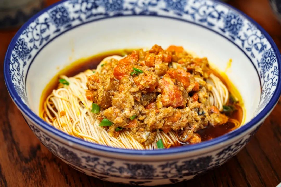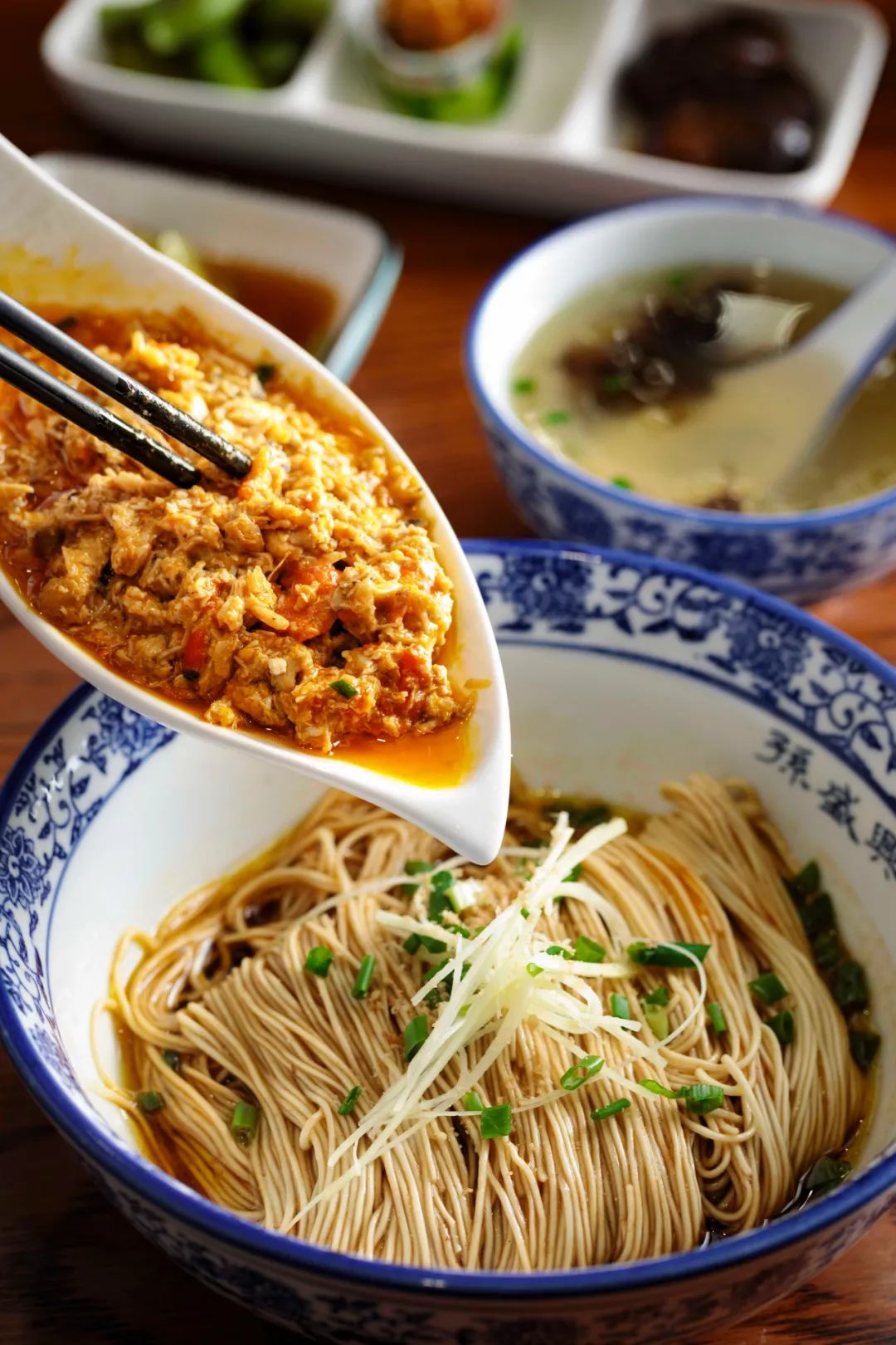蟹粉倒入面中后要快速拌匀,才能让每一根面条上都裹满蟹粉。每吸溜一口,就像一颗鲜味炸弹在口腔迸射。