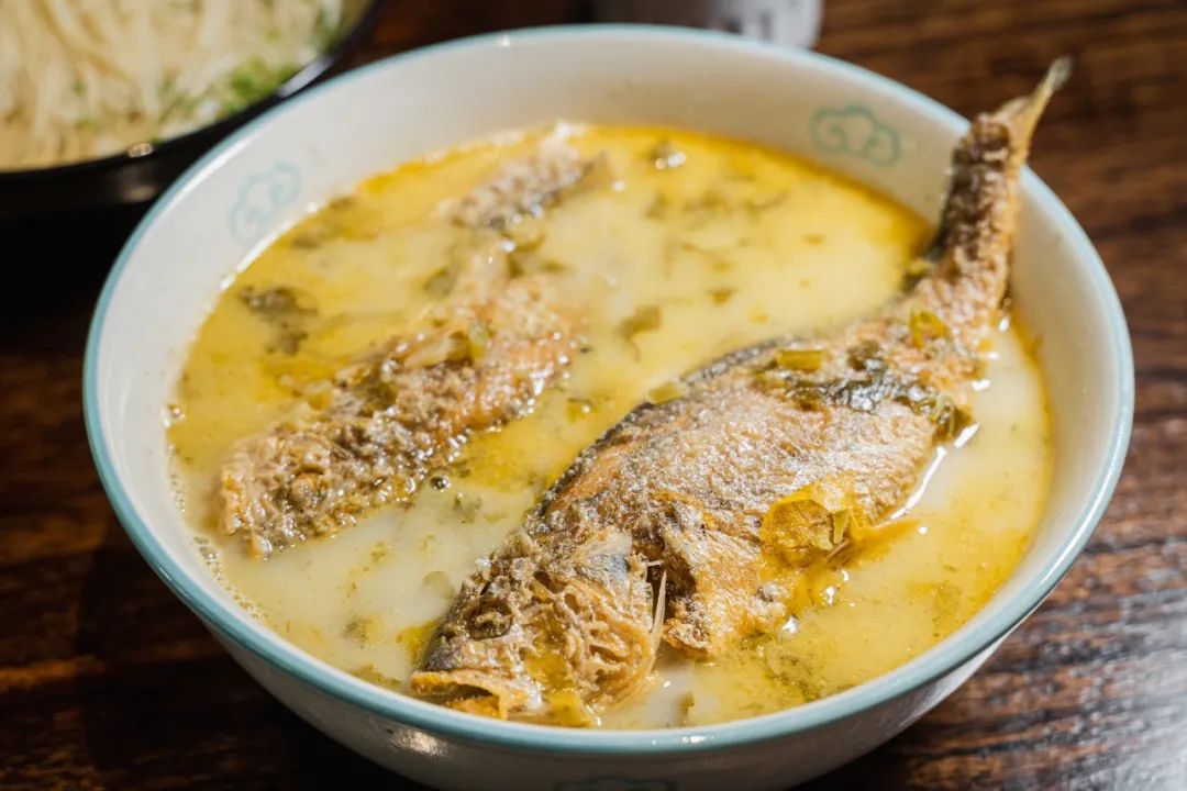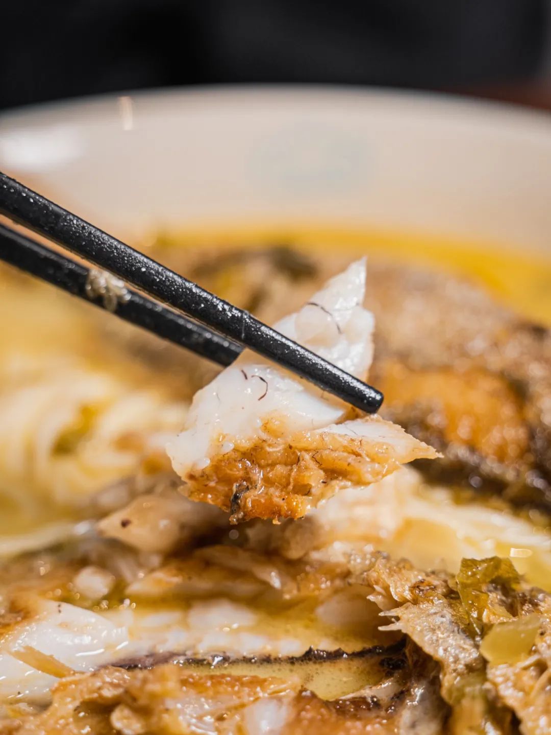 鲜美的黄鱼汤打底,再在面上码放一到两条完整的小黄鱼。黄鱼蒜瓣状的鱼肉细嫩鲜香,每根面条都裹上鲜香味美的黄鱼汤,是一份最好的时令美味。