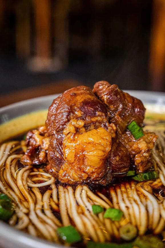苏式面的一个重要的红汤分支是昆山的奥灶面,奥鸭就是泡入奥灶汤里的鸭肉,大多是鸭腿。酥而不烂的鸭腿,透着奥灶面汤底里的鱼鲜和本身的肉鲜。