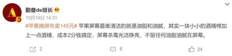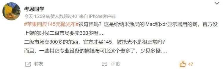 这一话题引起全网热议,并冲上热搜。其中吐槽最多的就是认为苹果把一块“抹布”卖到天价,简直是智商税巅峰。大部分网友都觉得很离谱:“不就是一块擦屏布吗,能擦出花来吗?”