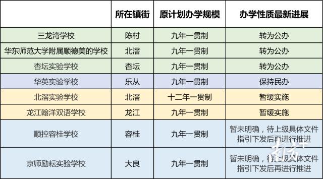 ▶顺德多所民办学校将转成公办 截至10月30日,顺德共有3所民办学校已明确将转为公办,1所明确保留民办性质,还有2所暂缓施工,2所暂时未明确办学性质。具体名单如下图。