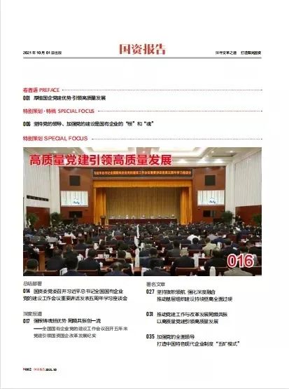 在国企党建工作会议召开五周年之际,《国资报告》杂志2021年第10期推出特别策划《高质量党建引领高质量发展》,梳理总结党建引领国资国企改革发展取得的显著成效,特约了若干篇中央企业负责人、专家学者的理论文章,采写提炼了若干国企强党建促发展的典型经验,多维度、全视角展现国资国企强根铸魂引航世界一流的宏伟实践,为更好促进做强做优做大国有企业、发挥国有经济战略支撑作用、加快建设世界一流企业凝心聚力、加油鼓劲。