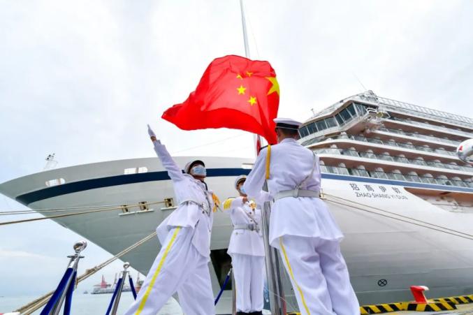 ▲2021年6月26日上午,中国首艘五星旗豪华邮轮——“招商伊敦”号命名暨首航仪式隆重举行。图为首航仪式上升起五星红旗。