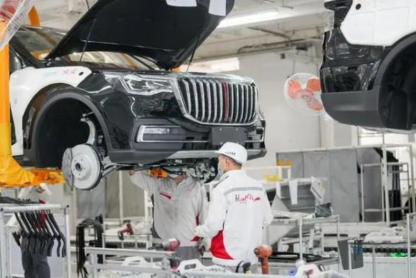 ▲在位于吉林长春的一汽红旗工厂总装车间,工人在装配车辆。