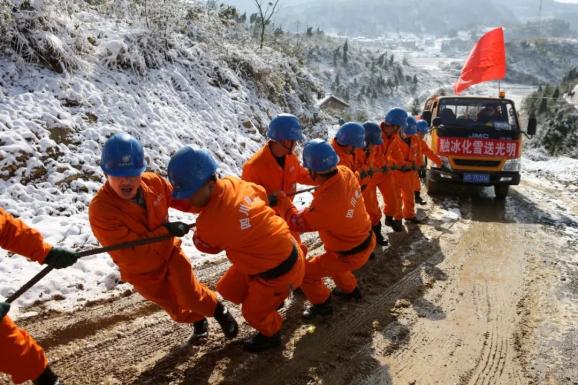 ▲国网四川电力共产党员服务队在万源海家坪村开展抗冰保电。