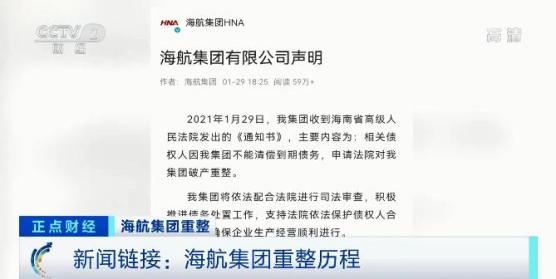 2021年1月29日,海航集团发布声明称,相关债权人因其不能清偿到期债务,申请法院对其破产重整。