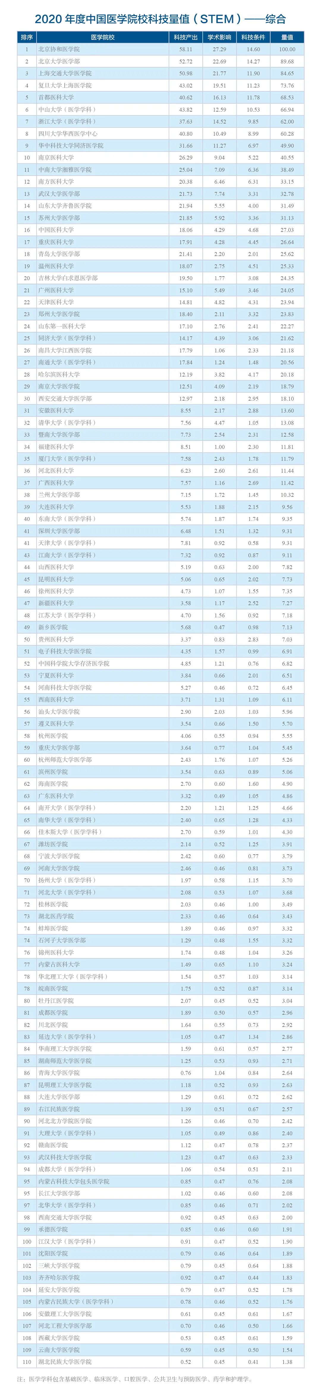 今年对全国110所独立医学院校和设立医学学科的综合大学科技量值进行测算(详细列表见后),综合分值位列前10的医学院校是:北京协和医学院、北京大学医学部、上海交通大学医学院、复旦大学上海医学院、首都医科大学、中山大学(医学学科)、浙江大学(医学学科)、四川大学华西医学中心、华中科技大学同济医学院、南京医科大学。