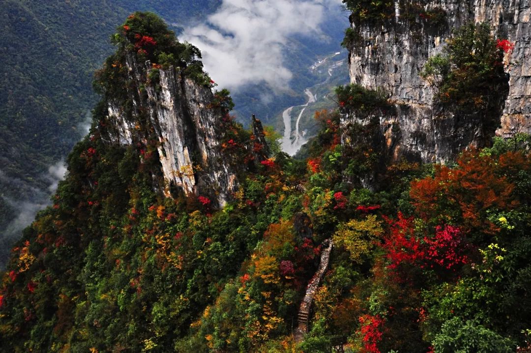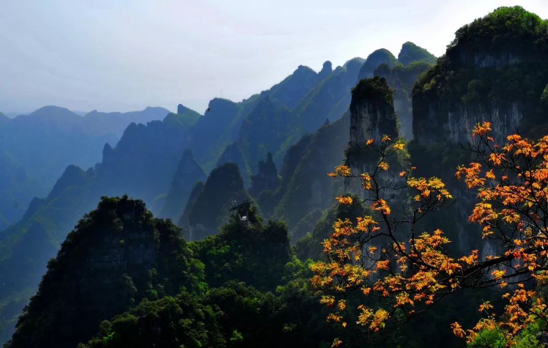 深秋时节的柴埠溪,成片的女儿红开满山林,真可谓是“奇峰三千从,峰峰女儿红”。
