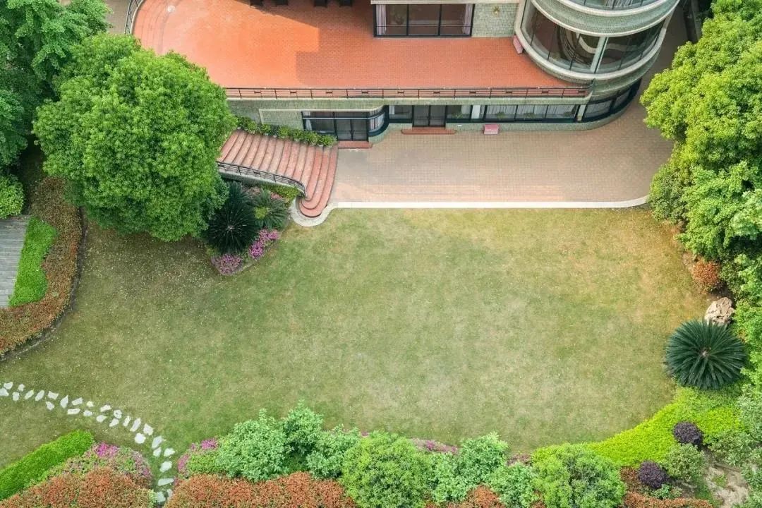 这座建筑二楼的起居客厅、餐厅等房间向内收进,朝南处有宽敞的生活露台,面积达70余平方米。厅前装有一排满堂的落地长窗,使室外露台和外面的庭园融为一体,满目美景尽收眼底。