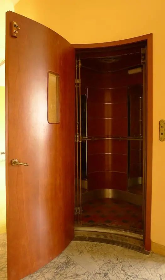 如今,走进“绿房子”,一部4层4站的古董电梯仍在正常运行,除更换过灯具以外,其他样式仍保留原样。不同于方方正正的现代电梯形状,这座电梯的轿厢呈优雅的荷叶状,轿门厅门为弧形连接,独特而罕见。电梯面积仅半个平方米左右,一次限乘3人;电梯内还配有镜子,可供乘坐者利用短暂时间整理衣冠,每个细节都隐藏着设计者的心思。
