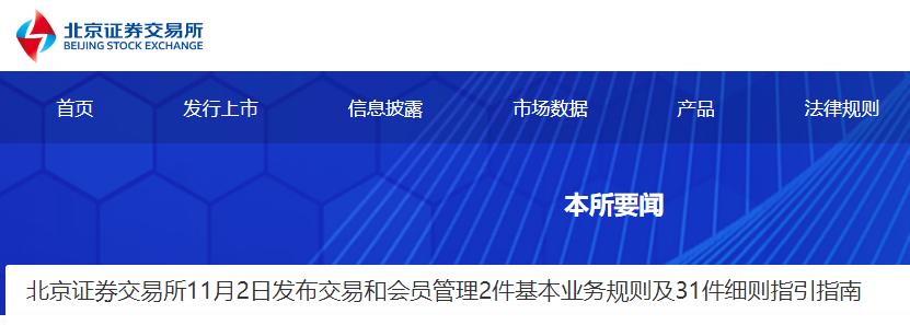 11月2日,北交所正式发布了《北京证券交易所交易规则(试行)》《北京证券交易所会员管理规则(试行)》2件基本业务规则及31件细则指引指南。上述业务规则自2021年11月15日起施行。