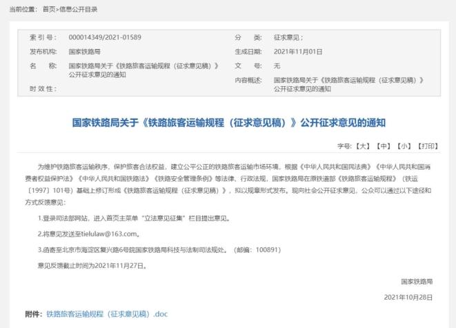 11月1日,国家铁路局发布关于《铁路旅客运输规程(征求意见稿)》(下称“征求意见稿”)公开征求意见的通知。
