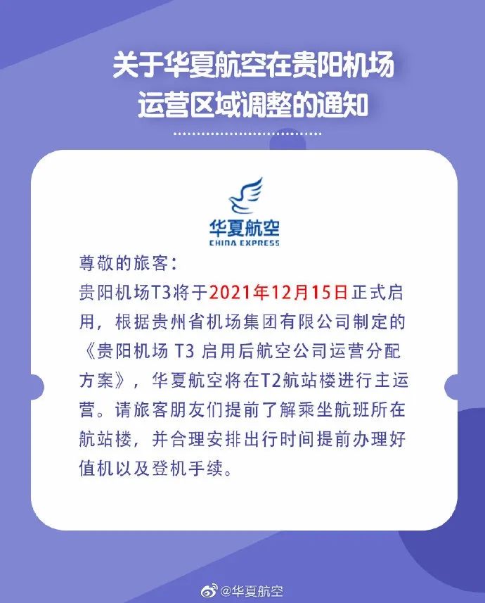 据华夏航空公告,贵阳机场T3将于今年12月15日正式启用。
