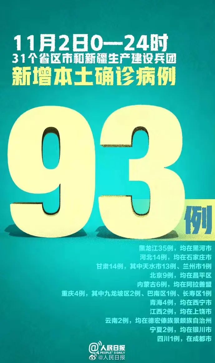 本土病例93例(黑龙江35例,均在黑河市;河北14例,均在石家庄市;甘肃14例,其中天水市13例、兰州市1例;北京9例,均在昌平区;内蒙古6例,均在阿拉善盟;重庆4例,其中九龙坡区2例、巴南区1例、长寿区1例;青海4例,均在西宁市;江西2例,均在上饶市;云南2例,均在德宏傣族景颇族自治州;宁夏2例,均在银川市;四川1例,在成都市),含1例由无症状感染者转为确诊病例(在北京)。无新增死亡病例。新增疑似病例1例,为境外输入病例(在上海)。