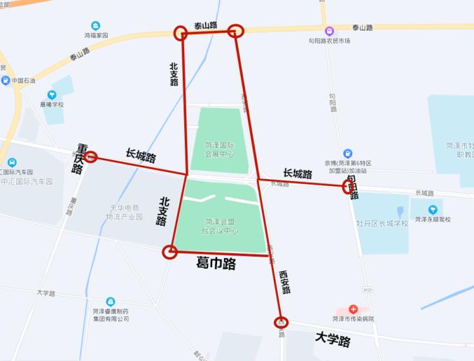 长城路(句阳路——重庆路段),泰山路(西安路至北支路段),西安路(泰山路——大学路段),北支路(泰山路——葛巾路段)。