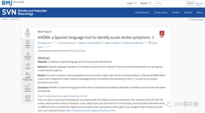 Stroke & Vascular Neurology(SVN)新近上线文章“AHORA: a Spanish language tool to identify acute stroke symptoms”,来自美国中佛罗里达大学医学院急诊医学系Latha Ganti(通讯作者)等。