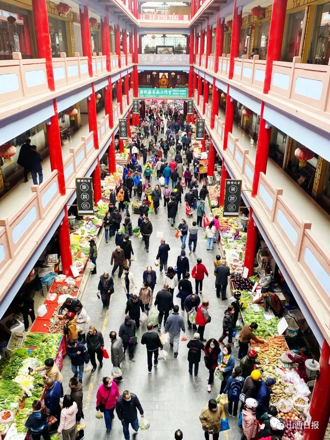 ▲在太原市迎泽区开化寺早市上,人们忙着选购蔬菜、水果、肉等生活必需品。