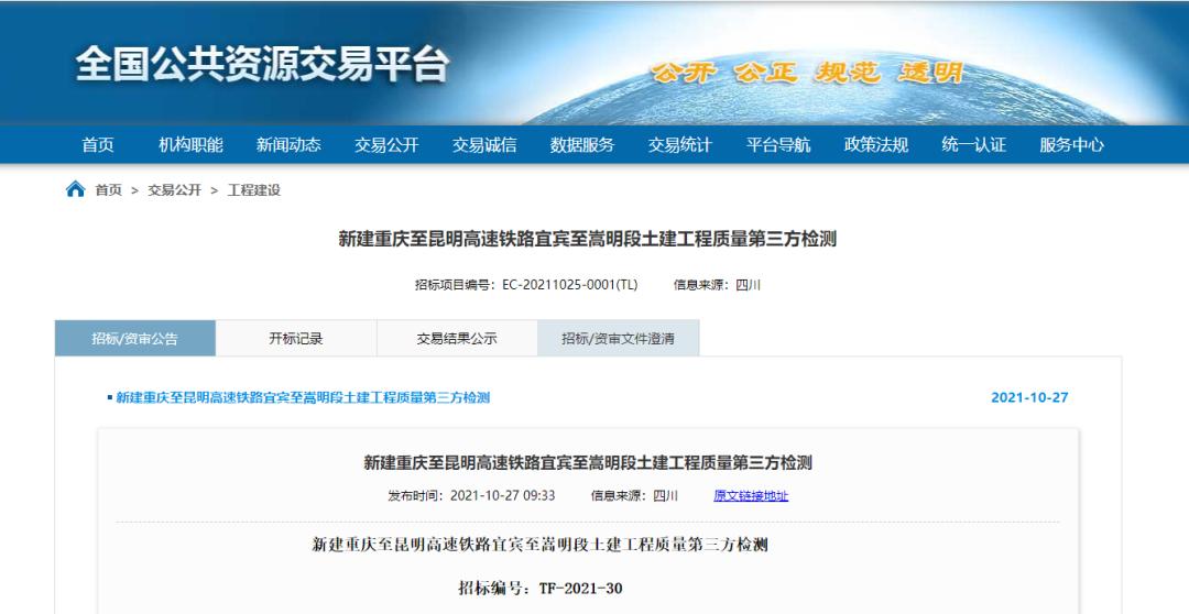 京昆高速铁路西昆有限公司10月27日发布的《新建重庆至昆明高速铁路宜宾至嵩明段土建工程质量第三方检测》显示,渝昆高铁宜宾至嵩明段土建工程质量第三方检测计划于2021年12月1日开工,工期2099日历天,2027年8月30日竣工。