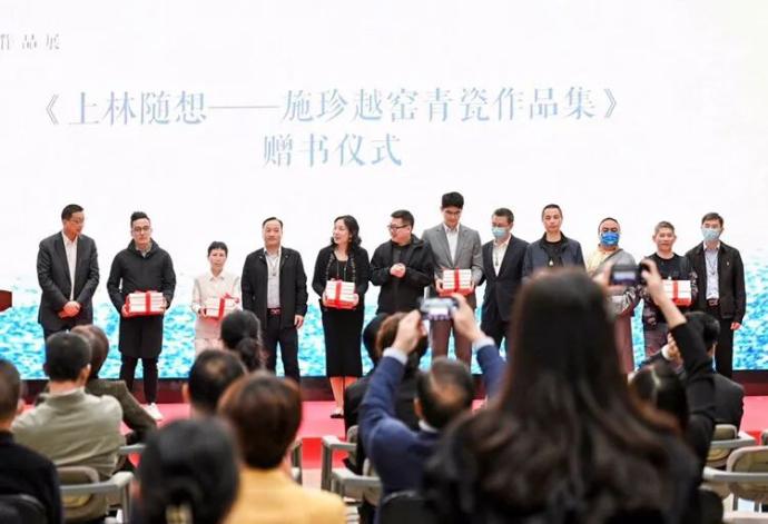 开幕式上,施珍作品《青瓷精品吉祥鸟双耳瓶》《上林随想瓶》分别赠予浙江省博物馆、浙江美术馆永久收藏。展览同名图录《上林随想——施珍越窑青瓷作品集》同步首发,并举行了“非遗进校园”慈吉教育集团战略合作签约仪式,将推动“非遗”进课堂、进校园。开幕式后,还举行了施珍越窑青瓷作品展研讨会。