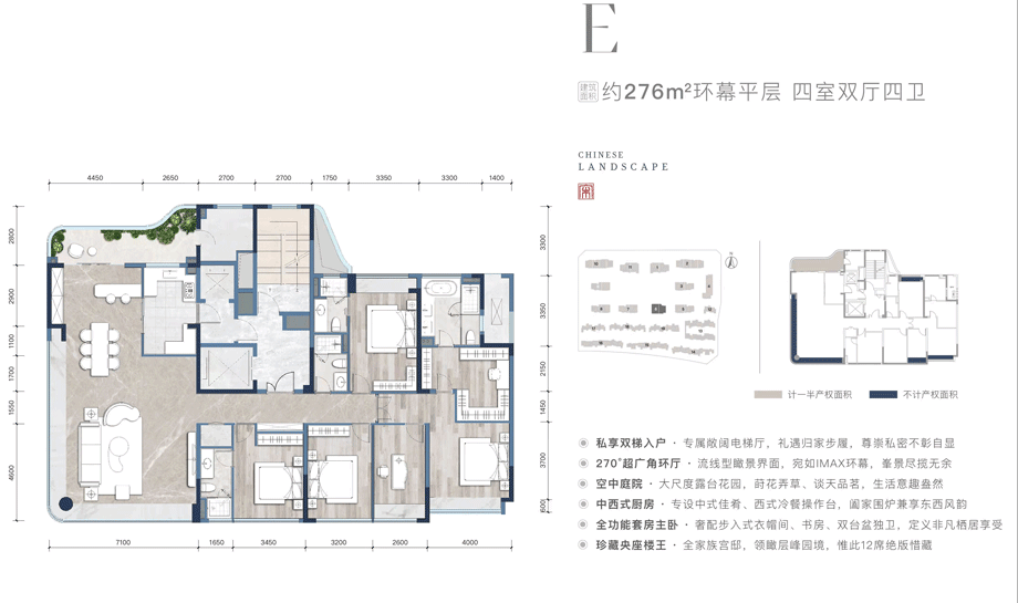 下图是绿城·凤栖麓鸣建面约276㎡的楼王户型,四室双厅四卫设计,在宣传资料上可以看到,电梯厅被规划为户内电梯,结构图上电梯厅所在位置也是计入产权面积的。
