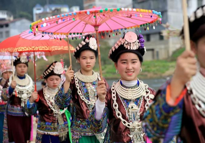 ▲柳州融水迎来传统“姑娘节”, 苗族侗族美女河边走来引欢呼。图片来源:视觉中国