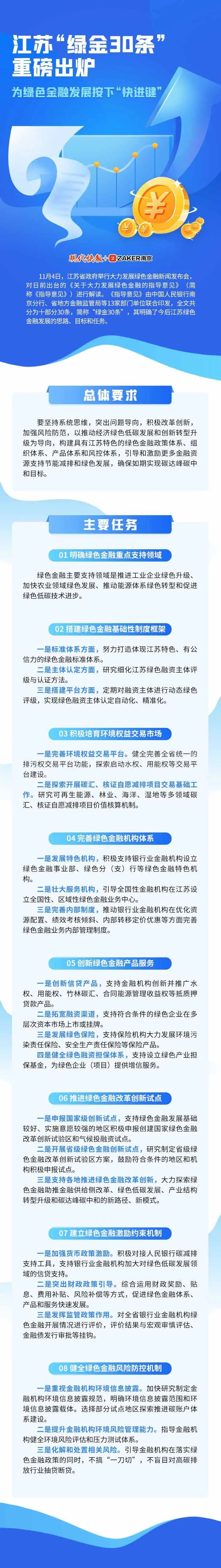 11 月 4 日上午,江苏省政府举行大力发展绿色金融新闻发布会,中国人民银行南京分行、省地方金融监管局有关负责人对 " 绿金 30 条 " 进行解读。据悉," 绿金 30 条 " 明确了今后江苏绿色金融发展的思路、目标和任务。其中提出不少高招、实招,包括探索开展碳汇、核证自愿减排项目交易基础工作,支持符合条件的绿色企业在多层次资本市场上市或挂牌,引导全国性金融机构在江苏设立绿色金融业务中心等。