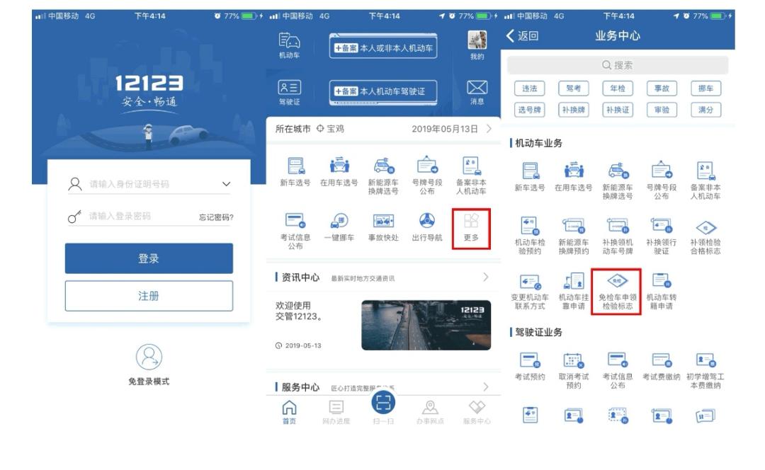 登录"交管12123"APP后,通过【业务中心】→【免检车申领检验标志】,进入免检车申领检验标志业务流程,用户可以为已备案的本人机动车免检车申领检验标志。