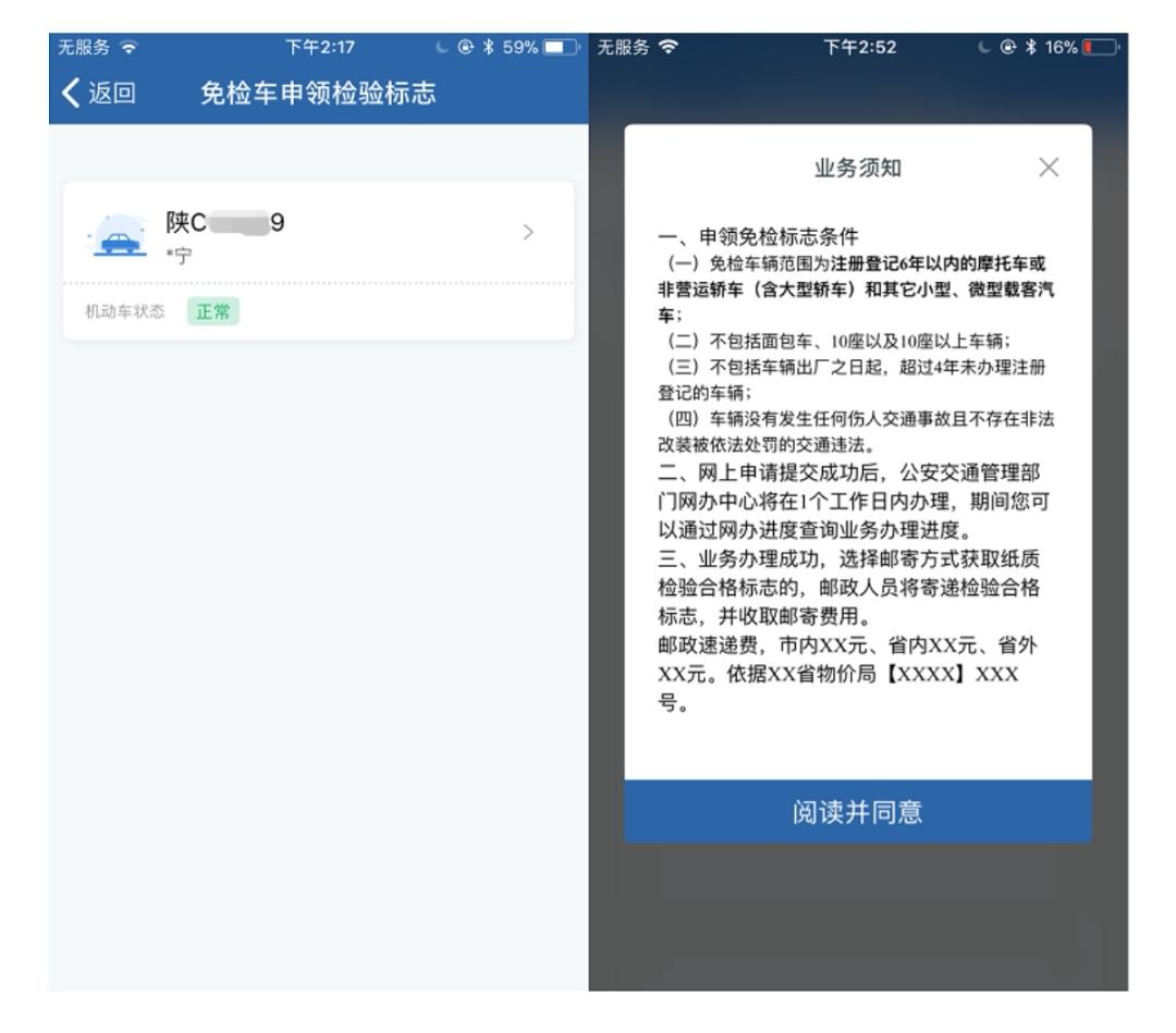 用户选择需免检车申领检验标志的机动车。认真阅读免检车申领检验标志业务须知后,点击【阅读并同意】进入车辆信息确认页面。对于交强险和车船税联网核查是否通过的,分别进入两个不同的业务操作流程。