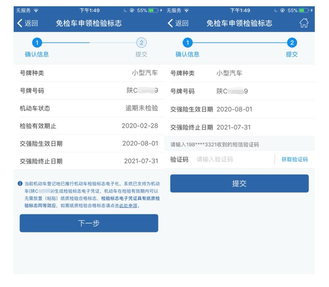 确认车辆信息页面,包括号牌种类、号牌号码、机动车状态、检验有效期止、交强险生效日期、交强险终止日期信息,点击【下一步】进入信息确认提交页面,用户再次核对免检车申领检验标志申请信息,待确认所填资料信息无误后,获取手机短信验证码,核验通过后,点击【提交】按钮,完成免检车申领检验标志业务申请信息提交。