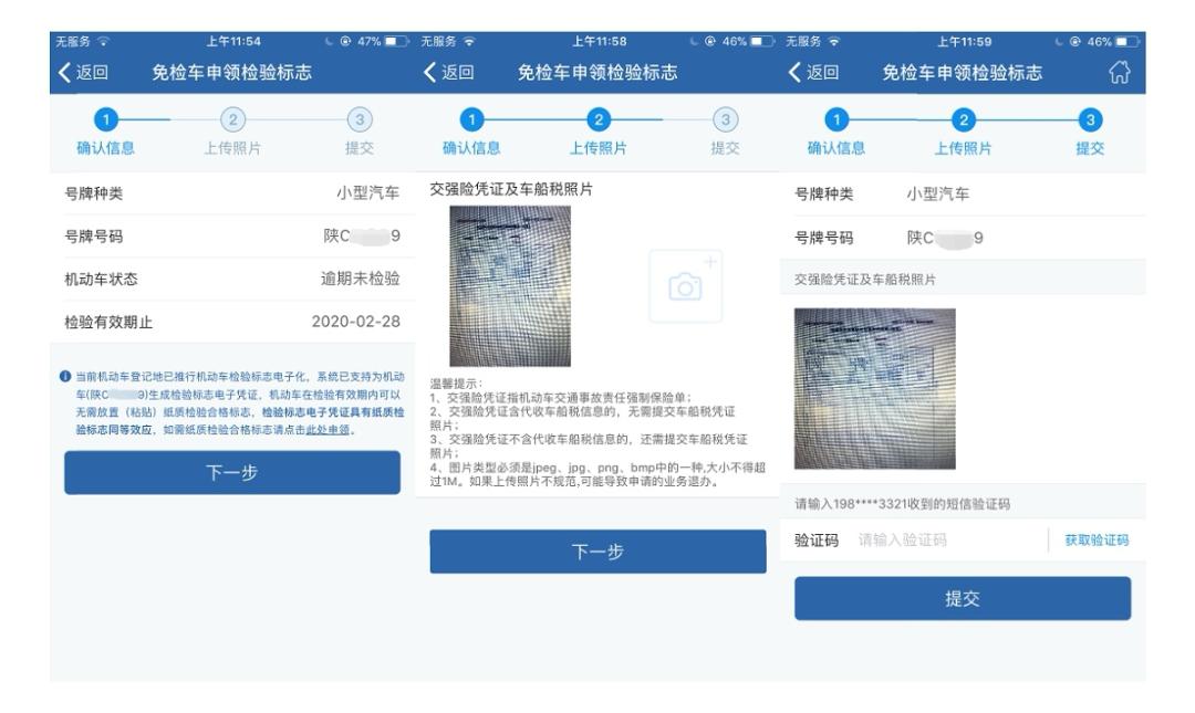 确认车辆信息页面,包括号牌种类、号牌号码、机动车状态、检验有效期止等信息后,进入资料信息填写页面,用户需上传交强险、车船税凭证照片,点击【下一步】进入信息确认提交页面,用户再次核对免检车申领检验标志申请信息,待确认所填资料信息无误后,获取手机短信验证码,核验通过后,点击【提交】按钮,完成免检车申领检验标志业务申请信息提交。