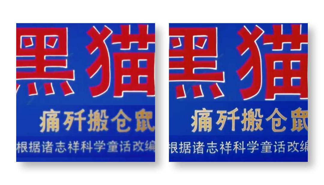 上图是 B 站用户上传的《黑猫警长》1080p 影片拷贝(ID:BV1XL41137AG),下图是《黑猫警长》在西瓜视频的高清修复版。点开两张图片并放大后,可以显而易见的看到,西瓜的修复版,其左侧线条及右侧文字边缘异常锐利清晰,勾线有近似矢量的清晰度,此外也去除了杂色(虽然在原版拷贝里已经处理得不错了)。