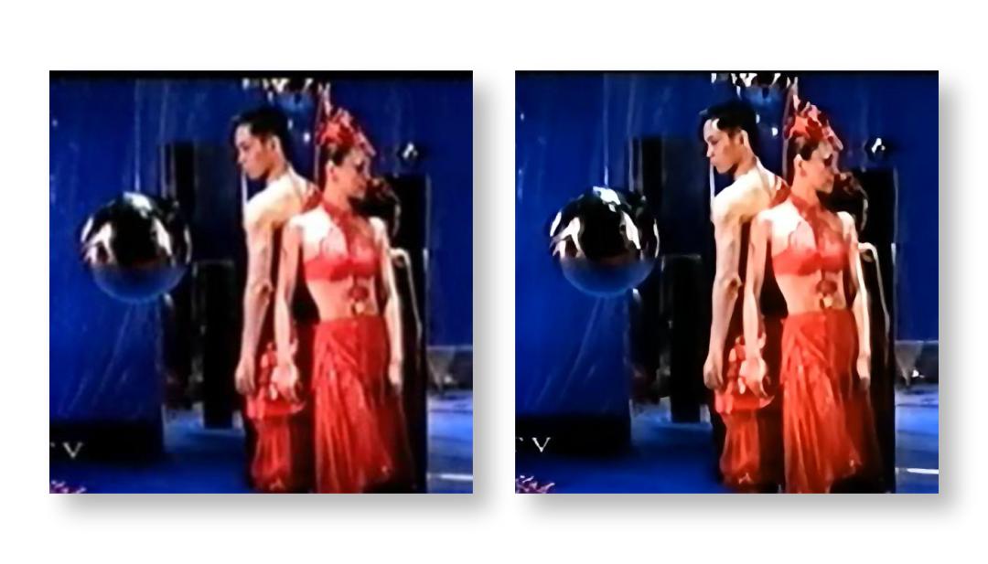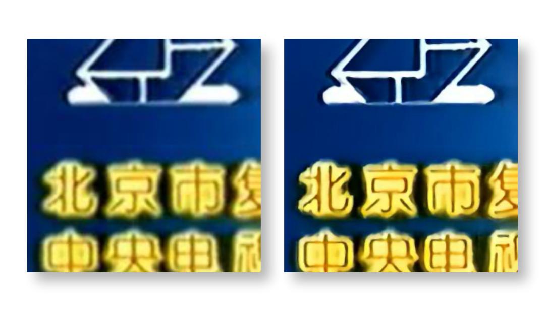 用电视画面来测试的另一个优势在于,它是二维线条图形和现场实拍画面的结合。实际上,在我们接下来的测试中,这种对照充分体现出了西瓜这个修复算法的特性——相对摄像机拍摄的现场画面和人像,它对人造图形的还原能力更强。