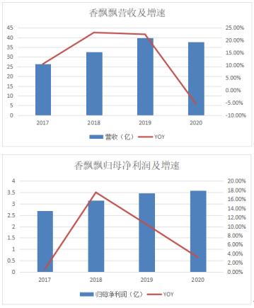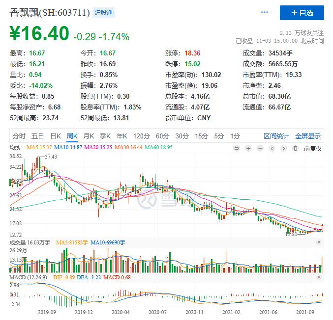 从二级市场表现来看,截至2021年11月3日,香飘飘收盘价为16.4元/股,总市值为68.3亿元,距离两年前的最高点缩水约90亿元,