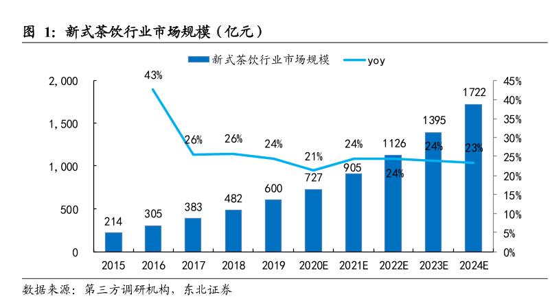 而新式茶饮的市场规模未来也将持续扩大。东北证券研报数据显示,预计到2024年新式茶饮市场规模将突破1700亿元,2015~2019年CAGR(年复合增长率)为29.4%,预计2019~2024年CAGR为23.5%。新式茶饮之间的竞争同样尤为激烈,高端、中端、低端都有众多企业进行卡位,代表品牌有喜茶、奈雪的茶、Coco、一点点、书亦烧仙草、蜜雪冰城等。