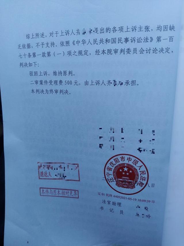 但令孙向波没想到的是,一审判决出来后,齐老太一方提出上诉。直到前不久,辽宁省沈阳市中级法院做出判决:驳回上诉,维持原判。