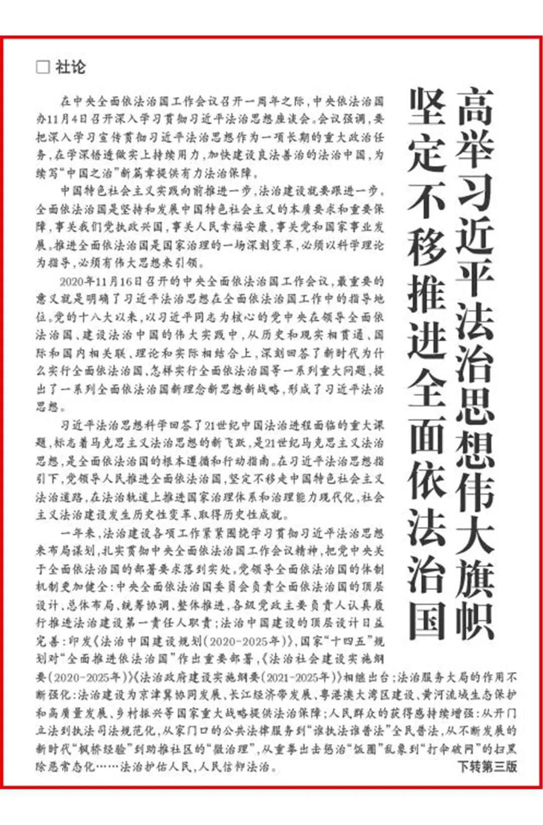一年来,法治建设各项工作紧紧围绕学习贯彻习近平法治思想来布局谋划,扎实贯彻中央全面依法治国工作会议精神,把党中央关于全面依法治国的部署要求落到实处。党领导全面依法治国的体制机制更加健全:中央全面依法治国委员会负责全面依法治国的顶层设计、总体布局、统筹协调、整体推进,各级党政主要负责人认真履行推进法治建设第一责任人职责;法治中国建设的顶层设计日益完善:印发《法治中国建设规划(2020-2025年)》,国家“十四五”规划对“全面推进依法治国”作出重要部署,《法治社会建设实施纲要(2020-2025年)》《法治政府建设实施纲要(2021-2025年)》相继出台;法治服务大局的作用不断强化:法治建设为京津冀协同发展、长江经济带发展、粤港澳大湾区建设、黄河流域生态保护和高质量发展、乡村振兴等国家重大战略提供法治保障;人民群众的获得感持续增强:从开门立法到执法司法规范化,从家门口的公共法律服务到“谁执法谁普法”全民普法,从不断发展的新时代“枫桥经验”到助推社区的“微治理”,从重拳出击惩治“饭圈”乱象到“打伞破网”的扫黑除恶常态化……法治护佑人民,人民信仰法治。实践证明,习近平法治思想是引领法治中国建设实现高质量发展的思想旗帜。