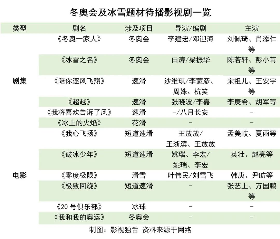 同样提上日程的,还有围绕着冬奥会、冰雪运动开发的影视作品。有的项目早早开工,已经在荧屏上成功亮相,还有些项目正在紧密筹备,估计会在后冬奥周期亮相。