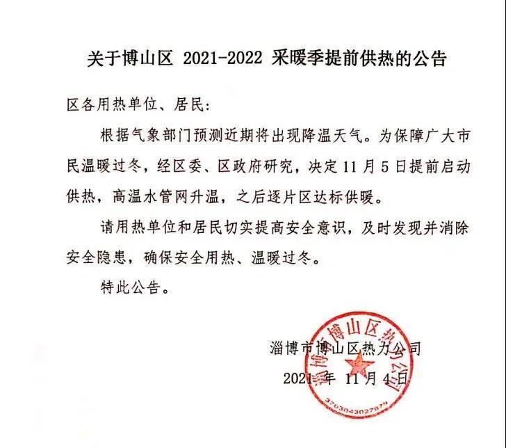 记者从淄博市博山区热力公司获悉,根据气象部门预测,近期将出现降温天气。为保障广大市民温暖过冬,当地决定于11月5日提前启动供热,高温水管网升温,之后逐片区达标供暖。