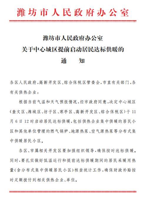 潍坊市人民政府办公室11月4日发布《关于中心城区提前启动居民达标供暖的通知》,通知要求,根据当前气温和天气预报情况,经潍坊市政府同意,决定中心城区(奎文区、潍城区、坊子区、寒亭区、高新开发区、综合保税区)于11月6日12时启动居民达标供暖,包括供热企业集中供暖的居民小区和其他单位管理的燃气锅炉、地源热泵、空气源热泵等分布式集中供暖居民小区。