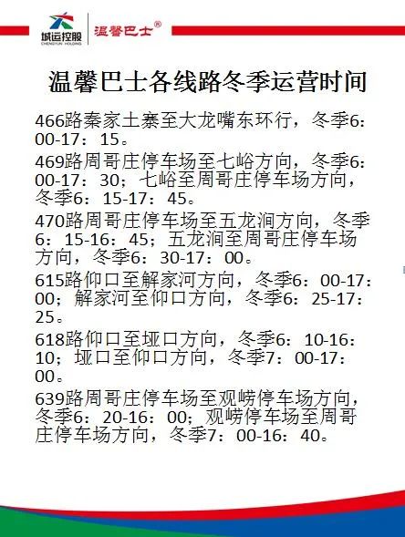 近日,城运控股交运温馨巴士对466路、469路、470路、615路、618路、639路共6条线路首末班发车时间进行了调整,实行冬季运行计划。同时旅游6路季节性停发,将持续到次年3月31日。