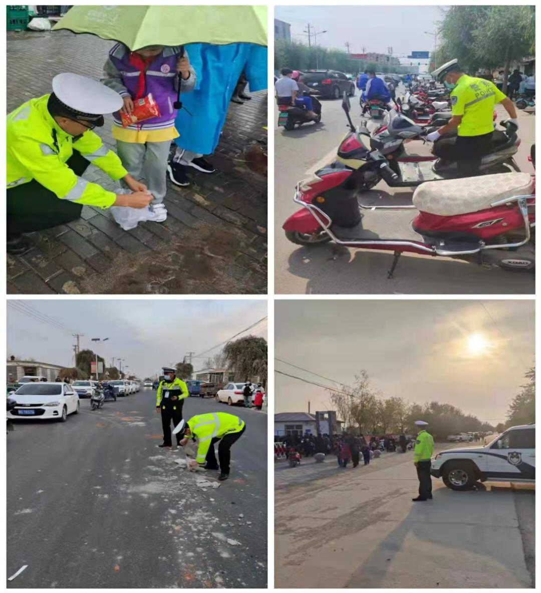 10月25日20时许,鲁特旗公安局交警大队香山中队民辅警刘思远、包洪英、陈海波在S306线巡逻执勤时,发现一辆农用四轮车拉载的谷物大量洒落到路面上,此时夜间来往车辆川流不息,这样情况使得道路交通安全隐患大幅提升。见此情景,辅警刘思远、迟绍卿立即在洒落货物车辆的来车方向摆放反光锥筒提醒过往的车辆。随后,动手帮助将散落谷物物重新装车,保障路面通行,经过近一小时收拾清理,洒落谷物被重新装车,及时消除了道路交通安全隐患,解决了群众“困难”。