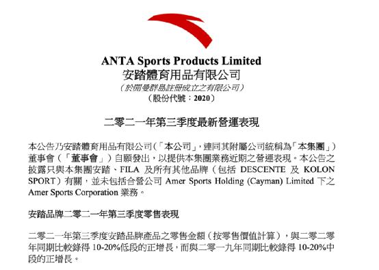 10月18日,安踏体育发布公司第三季度业绩报告,安踏品牌产品之零售金额(按零售价值计算),与2020年同期比较录得10-20%低段的正增长,而与2019年同期比较录得10-20%中段的正增长。