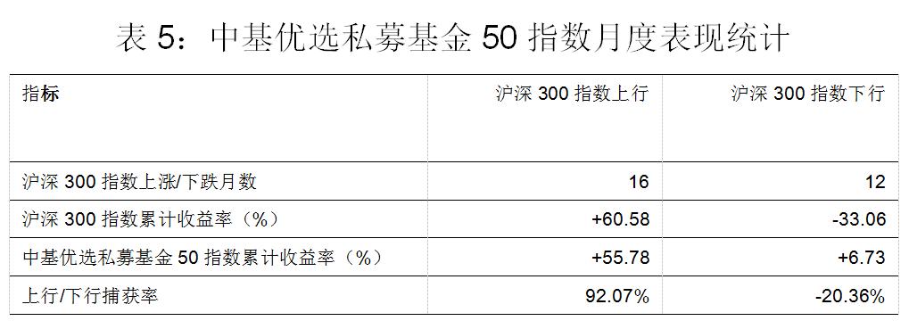 2019年7月以来,沪深300指数有16个月上涨,累计上涨幅度为61%,中基50指数在这些月份中涨幅接近56%,从比例上看捕获了沪深300指数近92%的涨幅,表明中基50指数几乎完全获得了沪深300指数上涨时的收益,显示出优异的收益捕获能力。