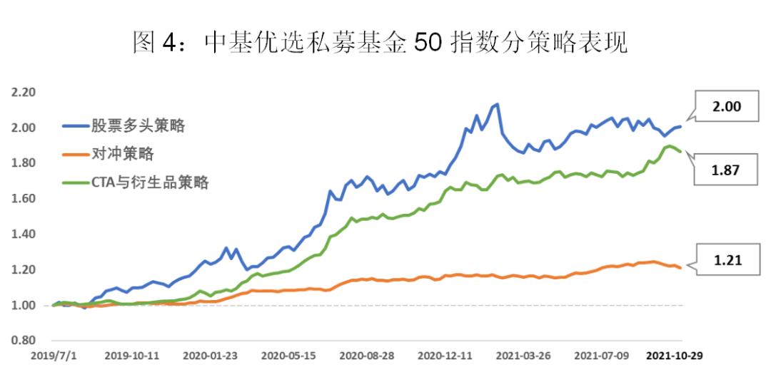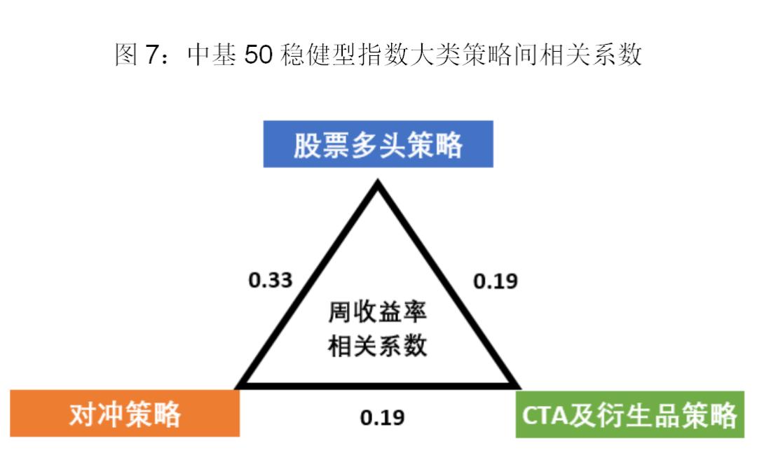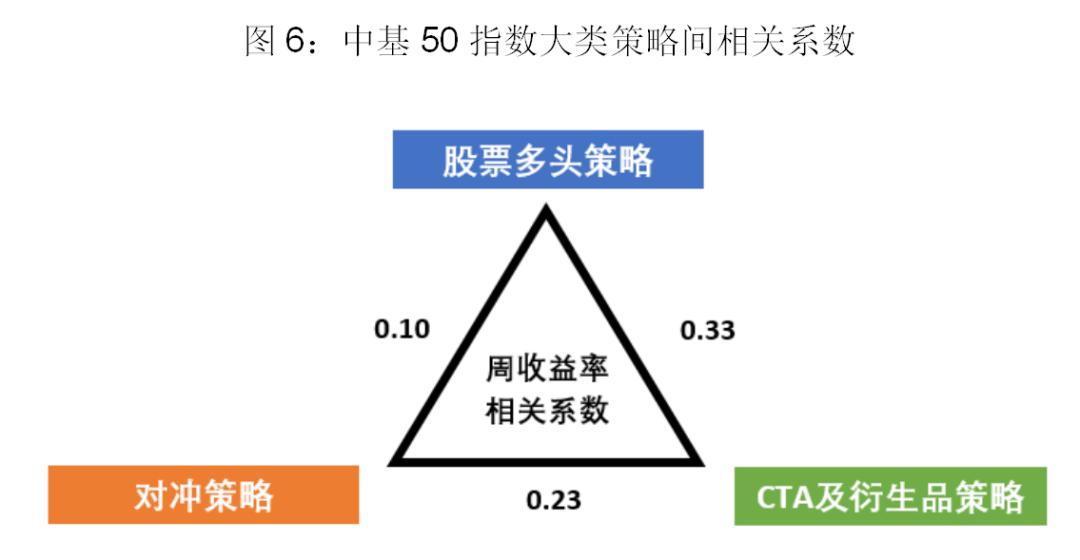 各类策略内基金的相关性也较低,股票策略的表现由于受系统性风险这个共同因素的影响,组内成份基金相关系数的平均值为0.62,处于相对较低水平;对冲策略、CTA与衍生品策略的组内成份基金相关系数的平均值分别为0.26、0.40,均处于低度正相关水平,这样的低组内相关性是二级策略差异化配置的成果,使风险在很大程度上得到了分散,是中基50指数获得相对较高夏普比率的主要原因。