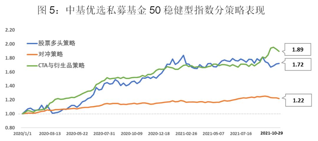 整体上看,高波动性的股票多头策略上升势头不改,短期虽有回撤但幅度有限,股票多头策略为指数提供了大部分收益;CTA及衍生品策略曲线持续稳步上升,9-10月表现强劲;对冲策略整体上运行平稳,自6月起发力向上。股票多头策略具有波动率高、进攻性强的特点,对冲策略表现稳定,CTA及衍生品策略波动性居中,收益比较有弹性,能够中和股票多头策略的一部分波动,提高了指数的防守能力。