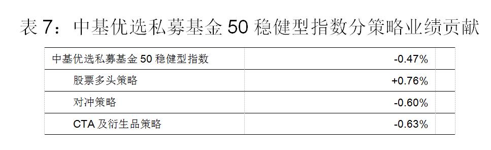 10月,中基50稳健型指数微亏0.47%,三类策略中,股票多头策略贡献了0.76%,对冲策略、CTA及衍生品策略分别亏损0.60%、0.63%。