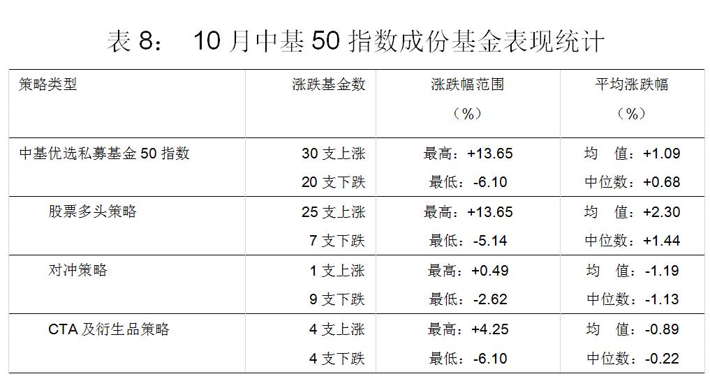 10月,50支成份基金中有30支基金净值上涨,三类策略中对冲策略、CTA及衍生品策略下的大多数成份基金盈利。