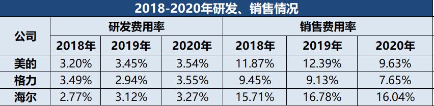 过高的销售费用吞噬了公司净利,也不利于新产品的推出。2018年和2020年,海尔研发费用率在三巨头中垫底。