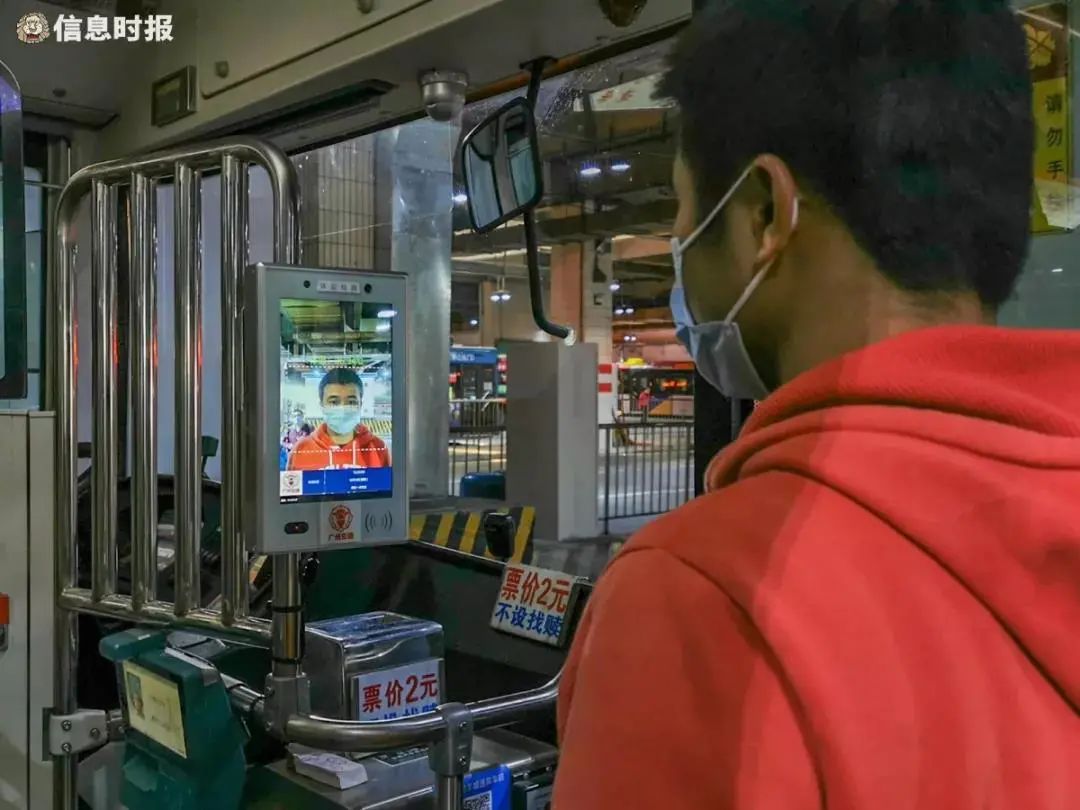 疫情期间,广州部分公交线路在全国率先试点安装人脸识别测温仪,乘客在乘车支付的同时,系统将自动完成测温,既减少测温人员的接触,也让防疫测温更加人性化。